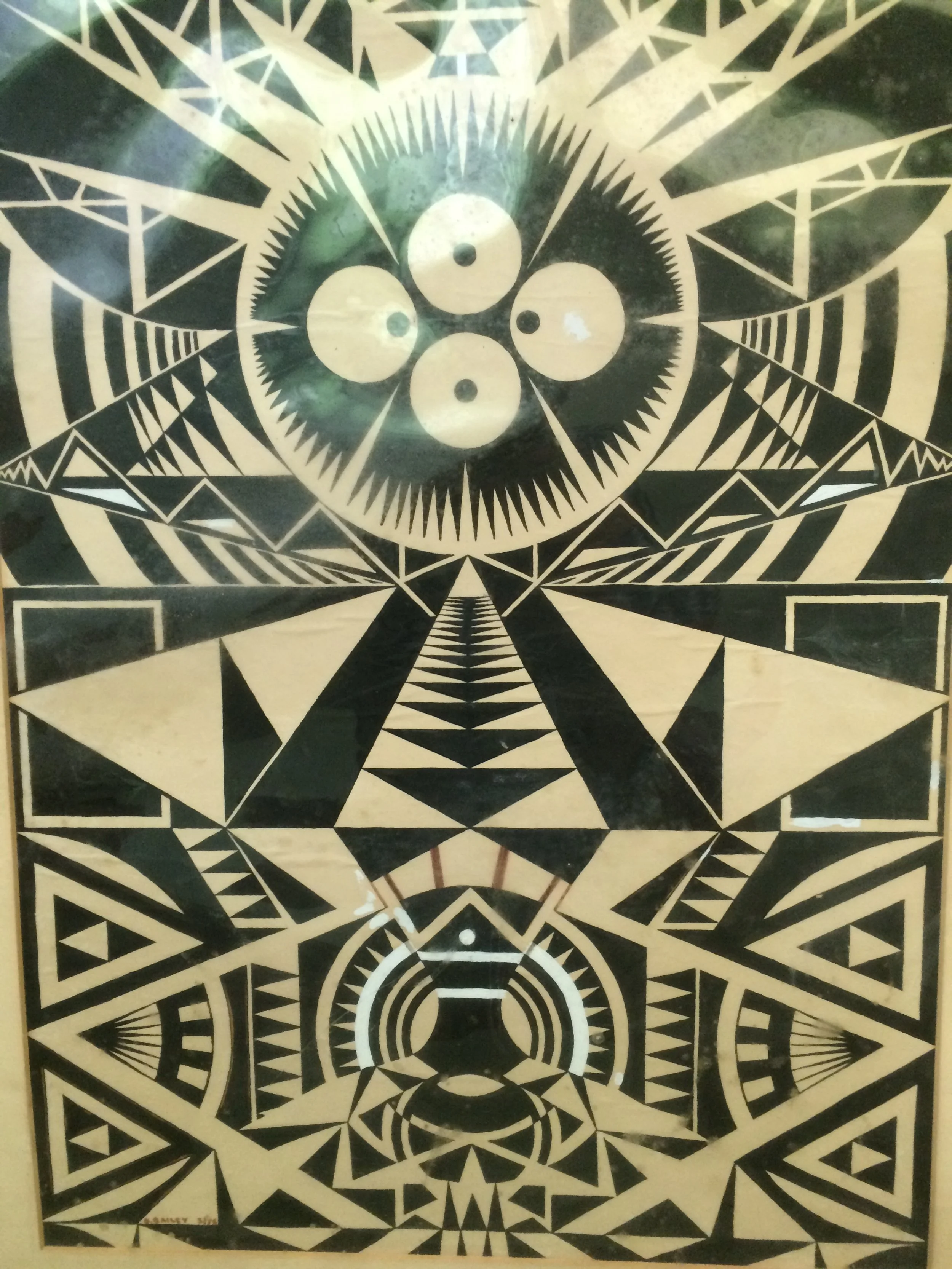 The original image was 16x24 in., done in ink on paper, created ca. 1974.  For many years it hung on the wall of a friend’s house.  Eventually, the acetate it was wrapped in began to disintegrate and it was put into a closet. After many years, the artist discovered it while visiting the friend, and photographed it, below left.